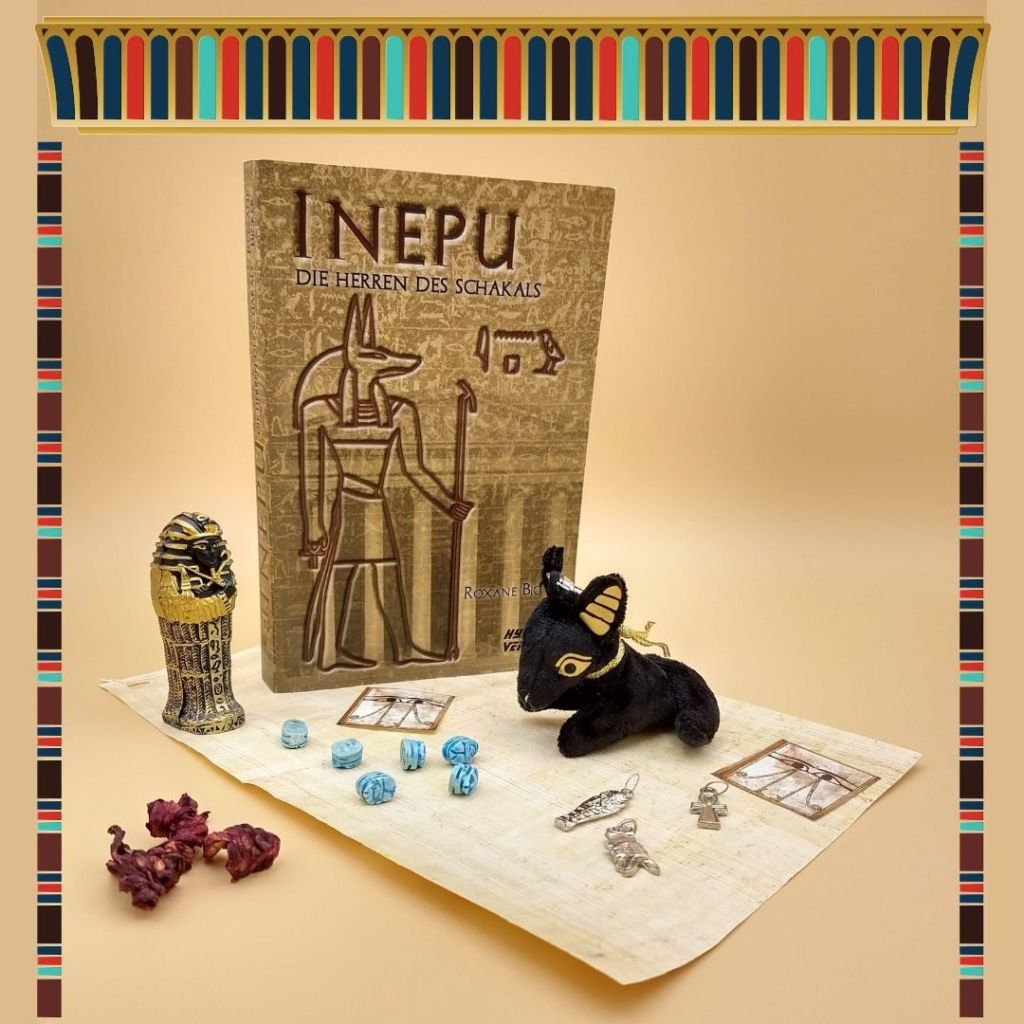 Zu gewinnen gibt es das Buch „Inepu“ (oder eines meiner anderen, wenn Du Inepu schon besitzt) und dazu ein ganzes Goodiepaket – im Bild nur ein Beispiel, der Plüsch-Anubis ist aber auf jeden Fall dabei!