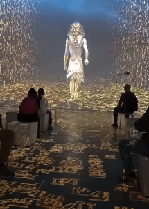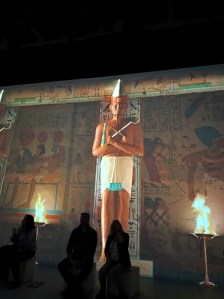 Auch die folgende Reise durch das Niltal hatte ziemliche Assassins-Creed-Vibes. Warum aus den Pyramiden Dampf steigt, hat sich mir übrigens nicht erschlossen. Auch nicht, wieso es auf einmal um den Tempel von Abu Simbel ging, der aus der Zeit Ramses‘ II. stammt. Dann wurden noch ein paar Tempelwände koloriert. An dieser Stelle möchte ich dann auch noch Tutanchamun selbst sprechen lassen, oder zumindest die Worte wiedergeben, die ihm in der Ausstellung in den Mund gelegt wurden. Zitat frei aus der Erinnerung: „Sie nannten mich einen Kindkönig, aber ich war auch ein Mann und bin in den Krieg gezogen!“, woraufhin er im Streitwagen einmal um einen herumgaloppiert ist.