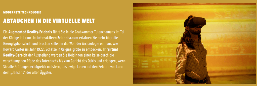 Das versprochene AR-Erlebnis war wohl eher das mit der VR-Brille. Andere AR-Anwendungen waren nicht zu finden. Mit dem interaktiven Erlebnisraum meinen sie vielleicht den Ausstellungsraum? Informationen zu den Hieroglyphen gibt es als einen kurzen Fun-Fact auf der Infotafel. Die Schätze in Originalgröße sind wohl die (schlechten) Repliken. Sorry, aber interaktiv war da nix. Der oben angekündigten VR-Bereich war so thematisch nicht vorhanden. Was man in der VR erlebt, habe ich ja oben beschrieben.