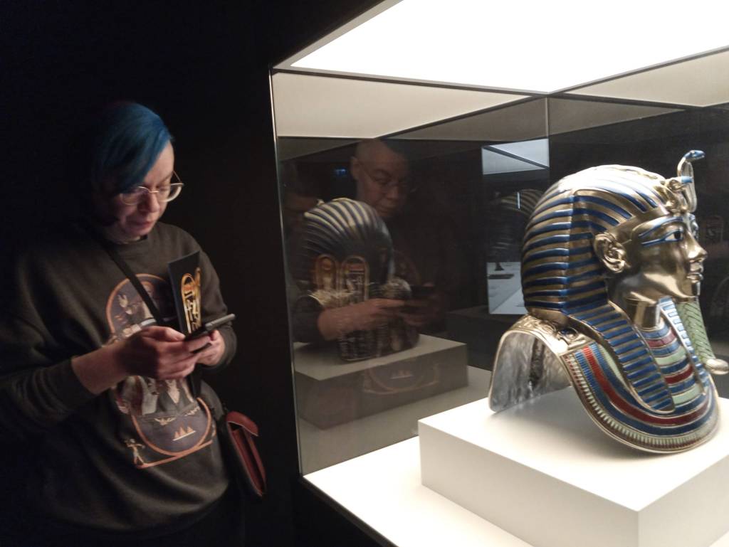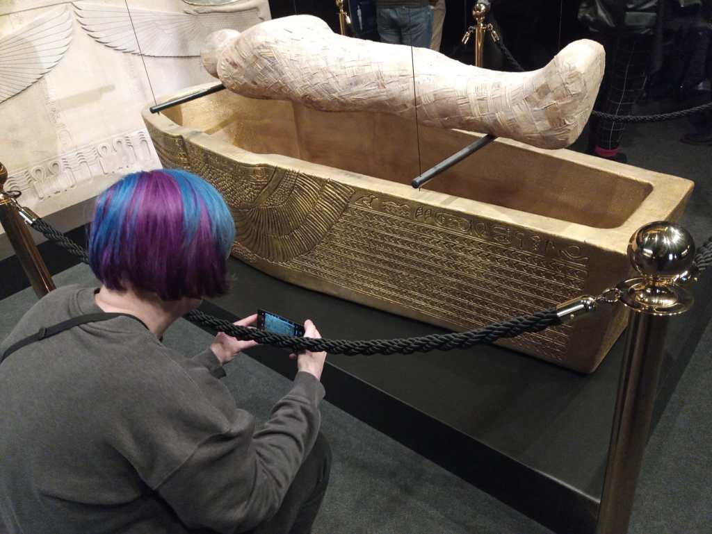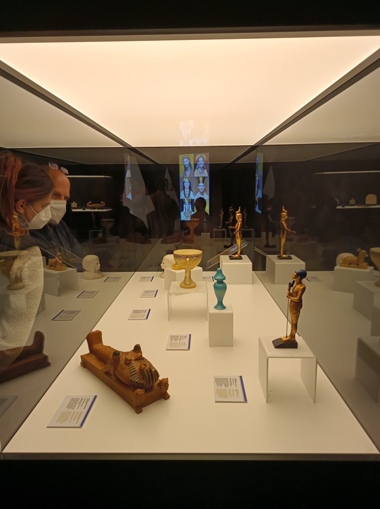 Hinter der Vitrine kann man im Bild oben noch eine Foto-Booth erkennen, in der man sich selbst in Pharaon*innen verwandeln konnte. Haben wir uns beim Besuch geschenkt. Bietet jetzt auch nicht den wirklichen Mehrwert.
