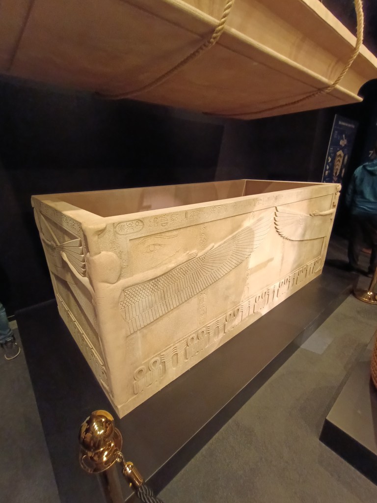 Linkerhand beim Hereinkommen steht der große Steinsarkophag, aus Plastik mit einem Flauschüberzug, der wohl den Stein imitieren soll. Voller Freude habe ich mir die Hieroglyphen angeschaut und stutzte das erste Mal. Bei einer Replik erwartet man ja nun eine 1:1 Umsetzung, aber falsch gedacht. Die Hieroglyphen entsprechen nicht dem Original, sie sind halt einfach Fake. Selbst die Kartusche mit dem Königsnamen ist halt … irgendwas. Und es stellte sich heraus, dass es bei allen anderen Repliken – dem Goldsarg, selbst der Goldmaske – ganz genauso war.