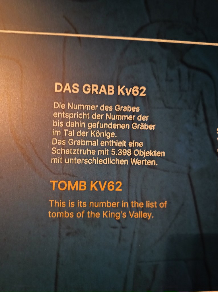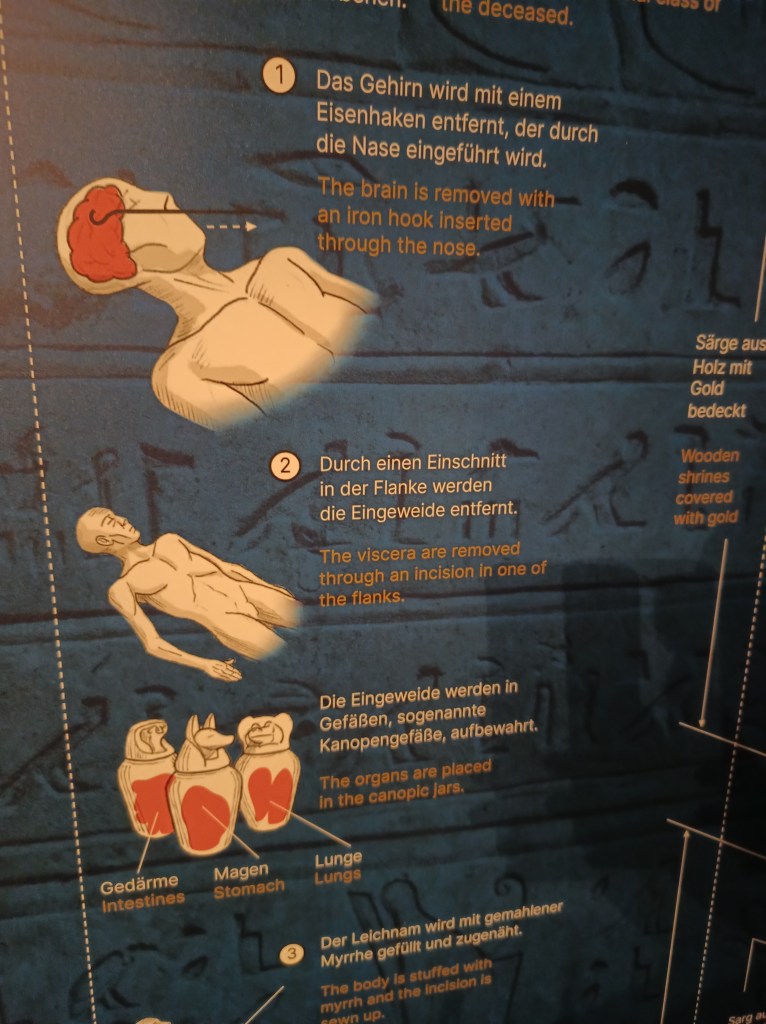 Hinter dem Goldsarg (mit Plastikmumie und nochmal der Goldmaske) fanden sich an der Wand große Beschriftungstafeln. Einmal zum Grab des Tutanchamun und (natürlich!) zur Mumifizierung und dann 21 Funfacts rund um Tutanchamun und die Grabung und das alte Ägypten.
